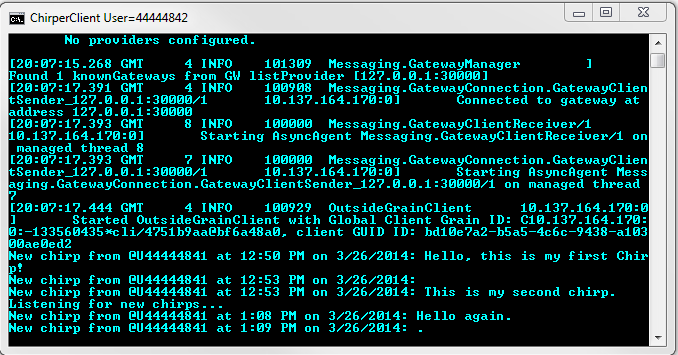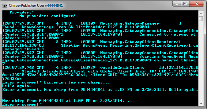 When you type a comment into the publisher window, the text is sent as a Chirp message to all followers of that user, including the first client console window, as well as being echo’ed on the publisher’s window.