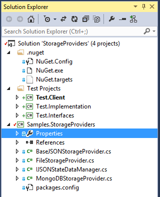 The sample solution consists of four projects – the storage provider library, and three test libraries, with the same client+server structure that the Hello World sample has.