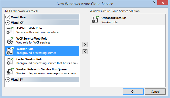 When prompted, select a new ‘Worker Role’ to add to the project. This will be used to host the Orleans Silos:
