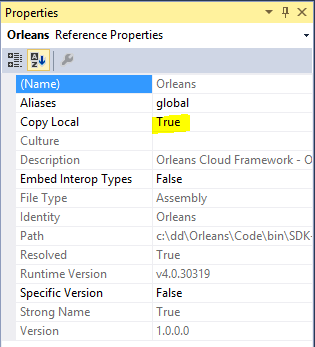 Note: All of these references MUST have Copy Local = ‘True’ settings to ensure the necessary library DLLs get copied into the OrleansAzureSilo project output directory.